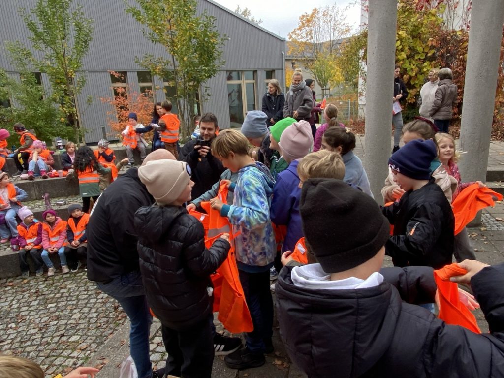 eine knallorange WARNWESTE geschenkt- passend zur aktuell laufenden Aktion: „IN DIE SCHULE GEH‘ ICH GERNE!“.