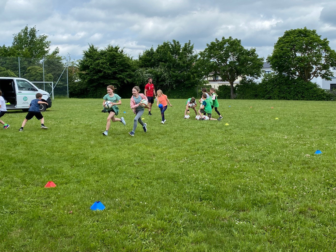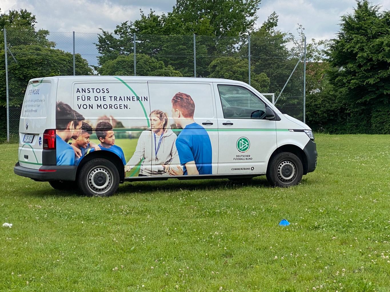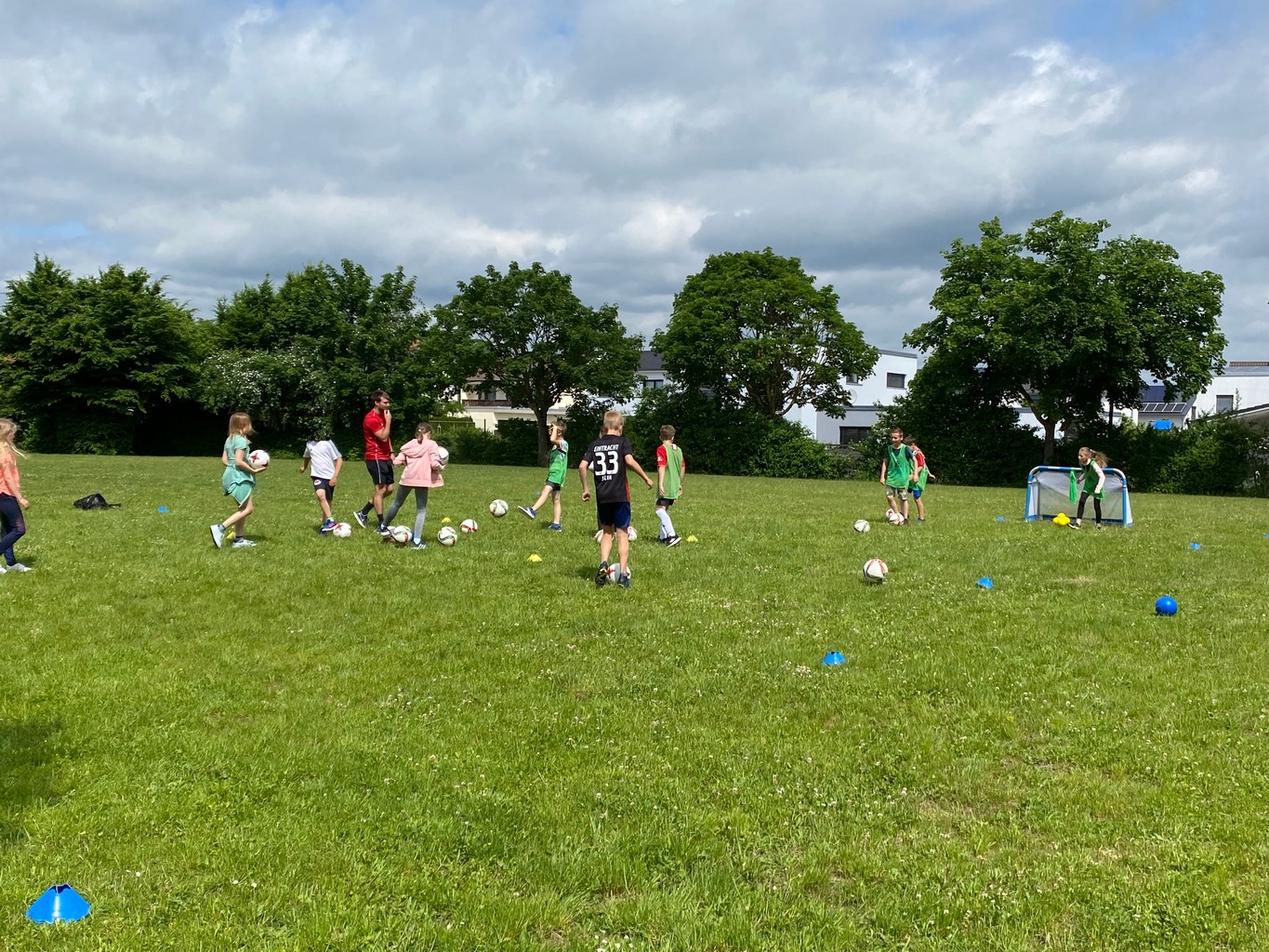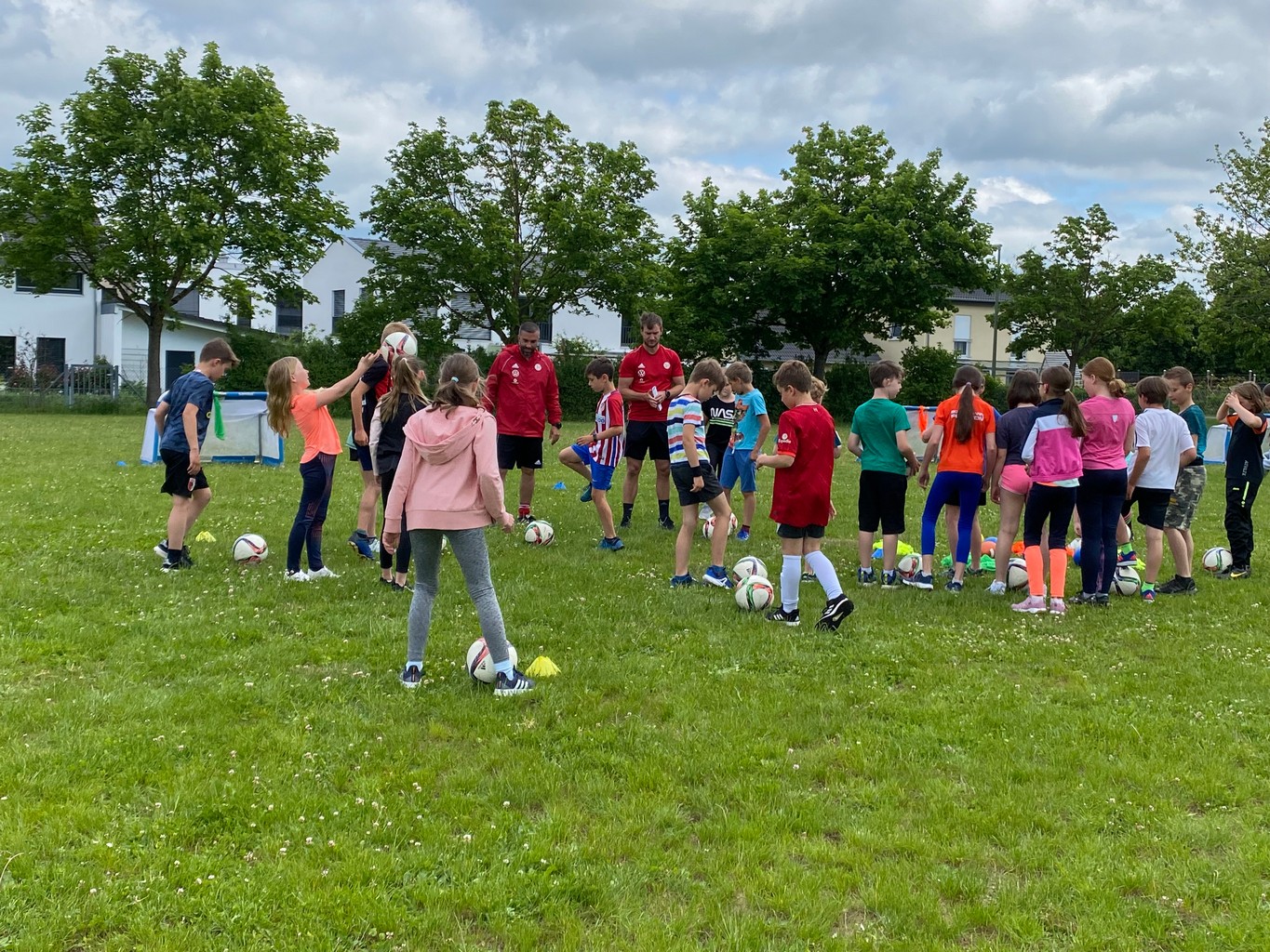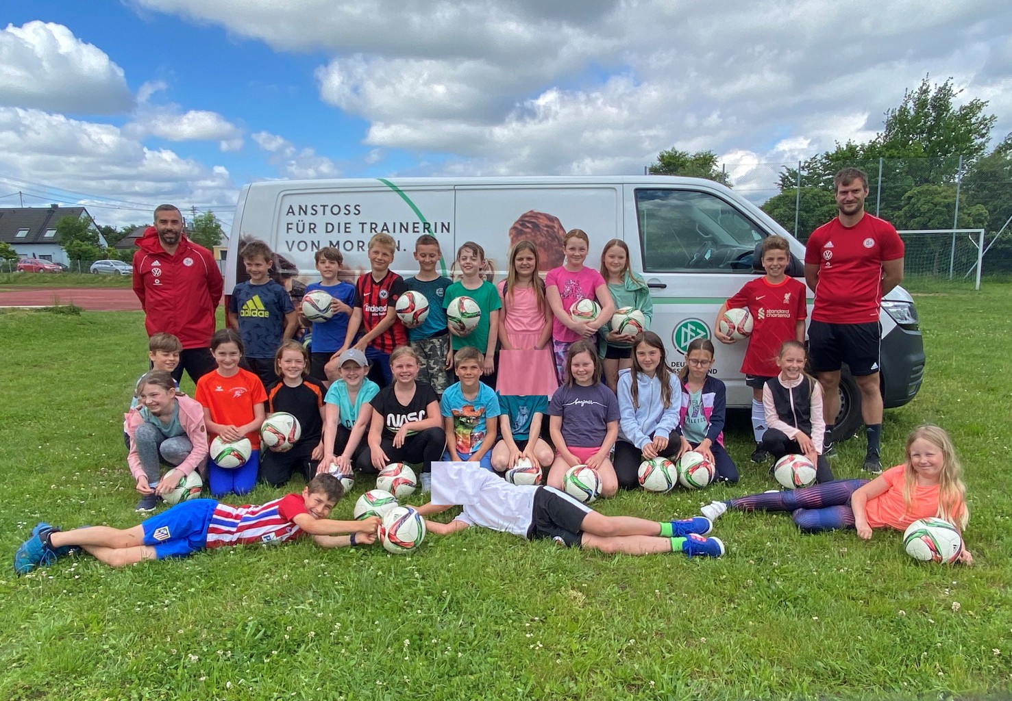 Die Viertklässler freuten sich sehr, als am Freitag, 27. Mai 2022 das DFB-Mobil mit den beiden Trainern Stephan Riedl und Matthias